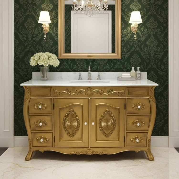 Discover the elegance of our Ornate French Period Bathroom Vanity Units with real Carrera Marble Top. Transport yourself to a time of opulence and sophistication. Immerse your bathroom in timeless beauty with intricate hand-carved detailing and vintage charm. You can find out more about our exquisite selection of finishes by contacting our team through the Custom Colour page. Elevate your space with luxurious storage options with these freestanding vanity units.